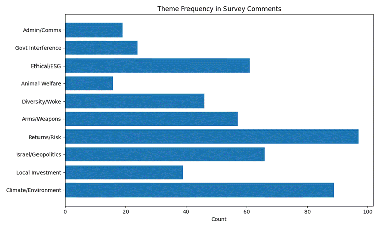 The following chart shows how often different issues appeared in the 1,200+ comments. Themes were identified using keyword groups (e.g., “return”, “risk”, “performance” → Returns/Risk; “climate”, “fossil”, “carbon” → Climate/Environment).